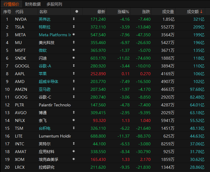 第4名美光收跌6.97%,成交196亿美元。至此该股已经连续第六个交易日下跌,自3月18日周三以来已累计下跌22%。当日该股收于历史新高,随后公布的第二财季业绩远超分析师预期。美光同时预测2026财年资本支出将远高于市场预期。