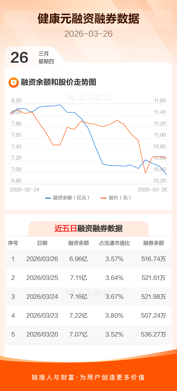交易所最新数据显示,健康元于2026年3月26日获融资买入1183.38万元,融资偿还2651.95万元,当日融资净偿还1468.56万元。目前,该股融资余额6.96亿,占流通市值比例为3.57%。