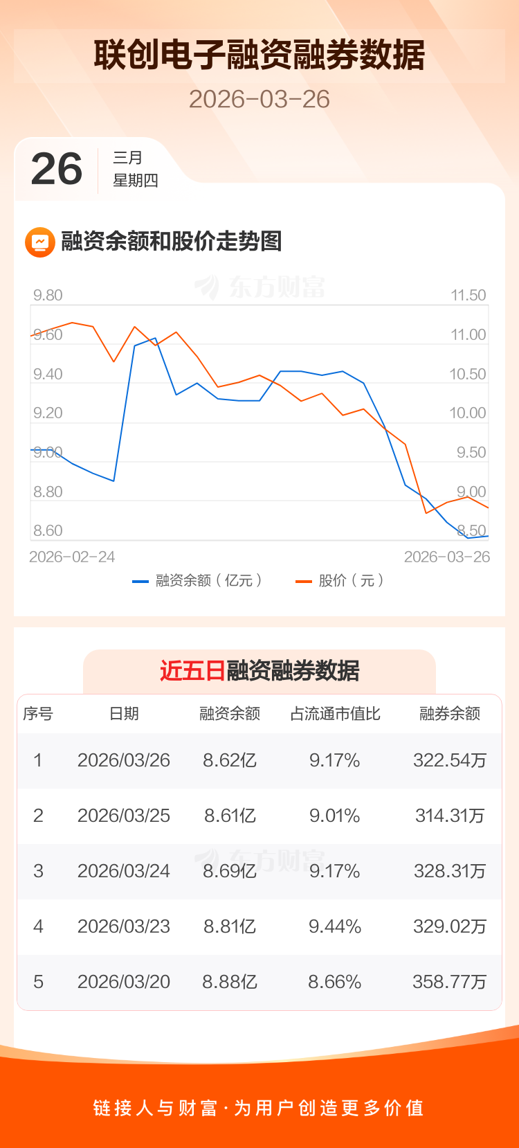交易所最新数据显示,联创电子于2026年3月26日获融资买入1642.72万元,融资偿还1480.11万元,当日融资净买入162.61万元。目前,该股融资余额8.62亿,占流通市值比例为9.17%。
