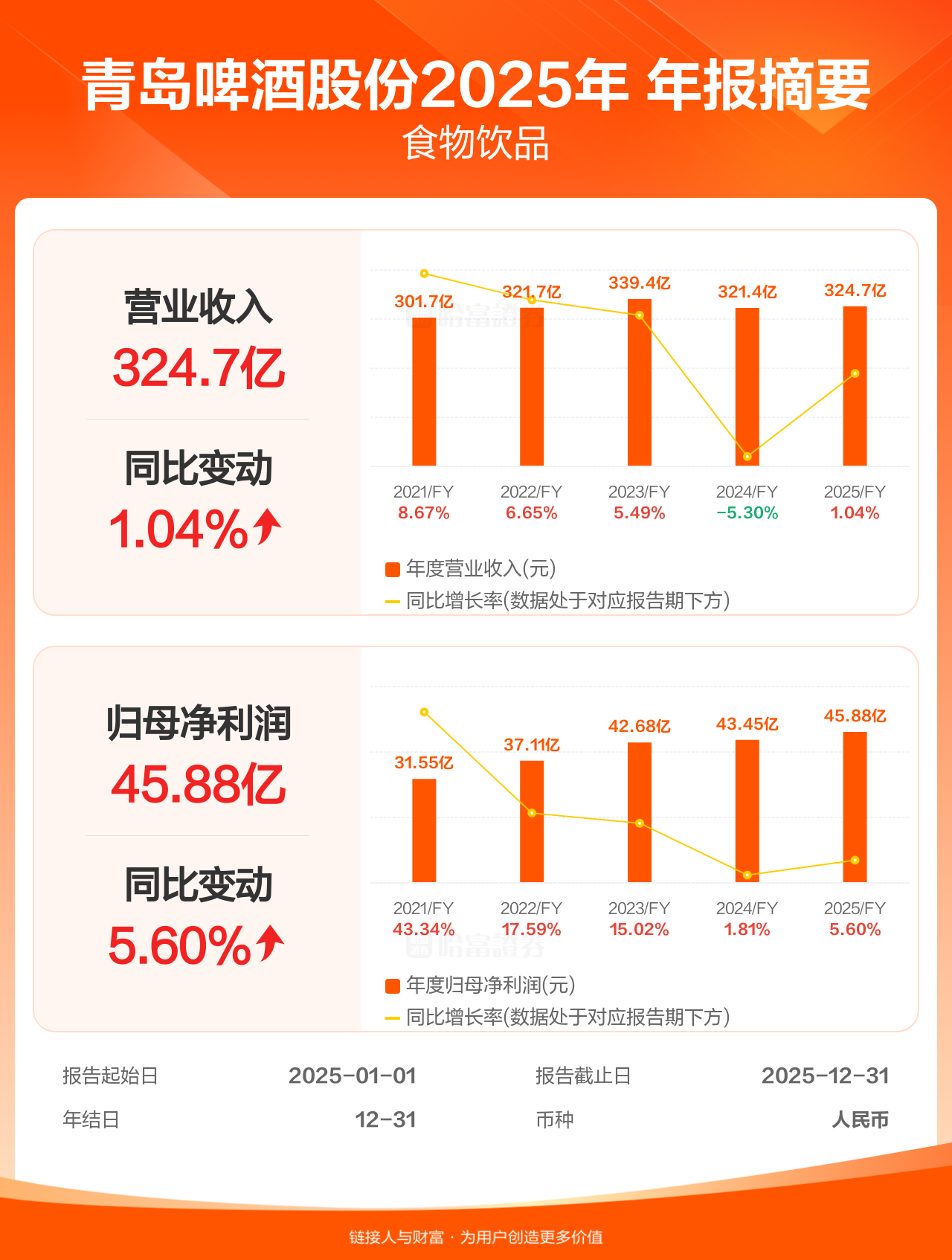 青岛啤酒股份3月26日发布年报业绩,截至2025年12月31日的12个月内,该公司营业收入324.73亿人民币,同比增长1.04%;公司权益持有人应占溢利(归母净利润)45.88亿人民币,同比增长5.60%,低于机构一致预测的50.03亿人民币。