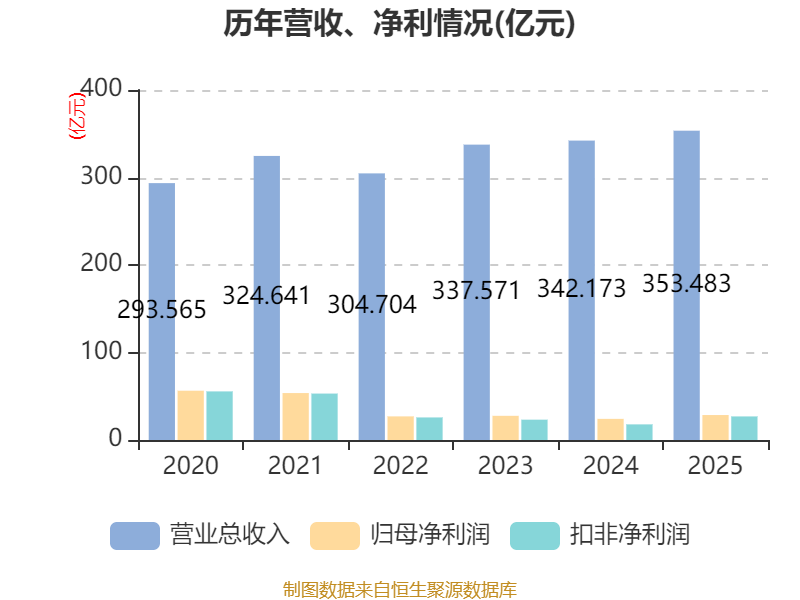 中证智能财讯华新建材(600801)3月27日披露2025年年度报告。2025年,公司实现营业总收入353.48亿元,同比增长3.31%;归母净利润28.53亿元,同比增长18.09%;扣非净利润26.94亿元,同比增长50.98%;经营活动产生的现金流量净额为66.94亿元,同比增长11.99%;报告期内,华新建材基本每股收益为1.37元,加权平均净资产收益率为9.05%。公司2025年度分配预案为:拟向全体股东每10股派现2.1元(含税)。