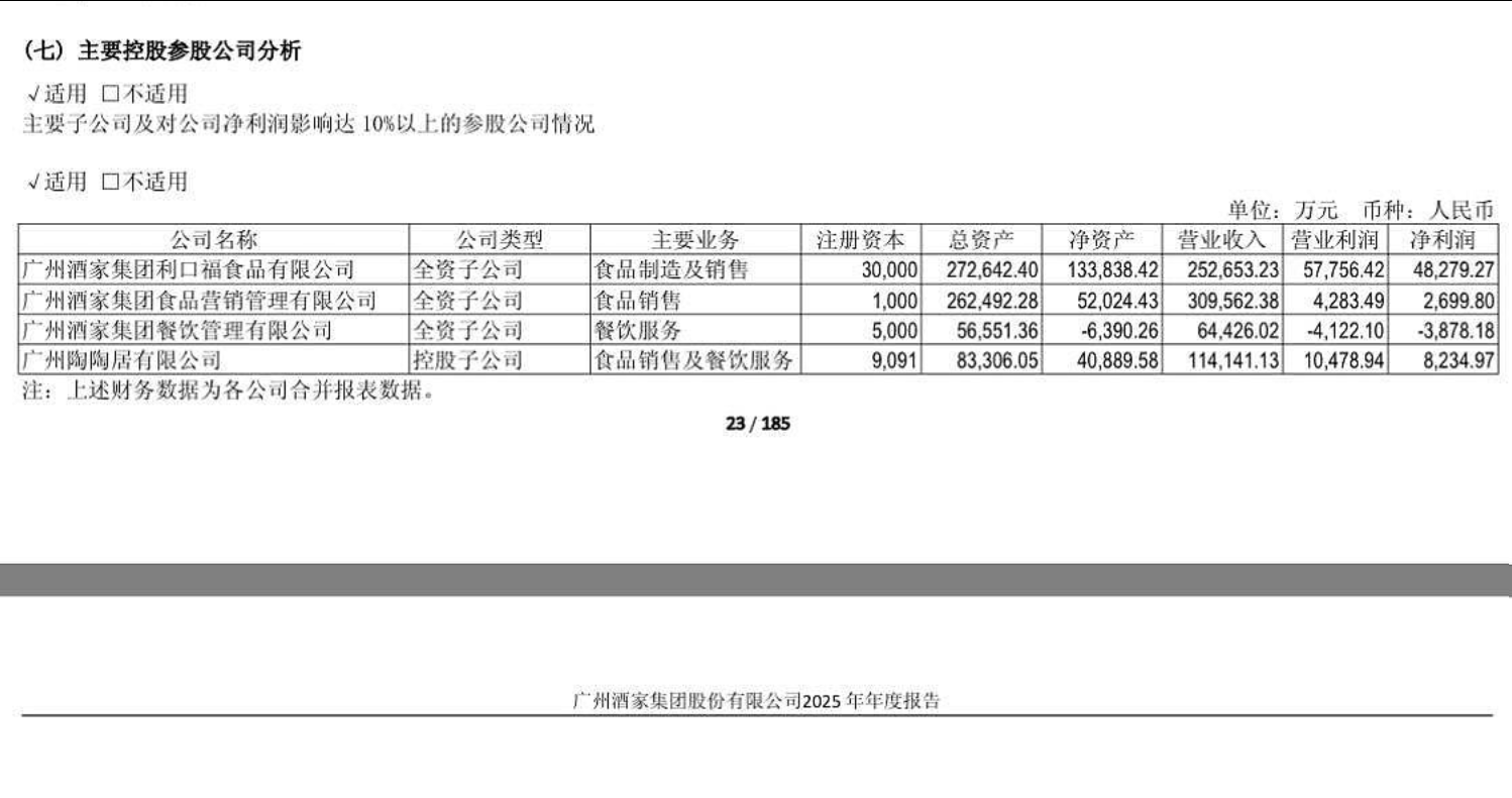 值得注意的是,从子公司数据来看,广州酒家核心餐饮运营主体“广州酒家集团餐饮管理有限公司”2025年实现营业收入6.44亿元,但亏损达3878万元,净资产为负6390万元,成为制约公司整体盈利能力的因素之一。2024年报显示,“广州酒家集团餐饮管理有限公司”亏损3188万元。