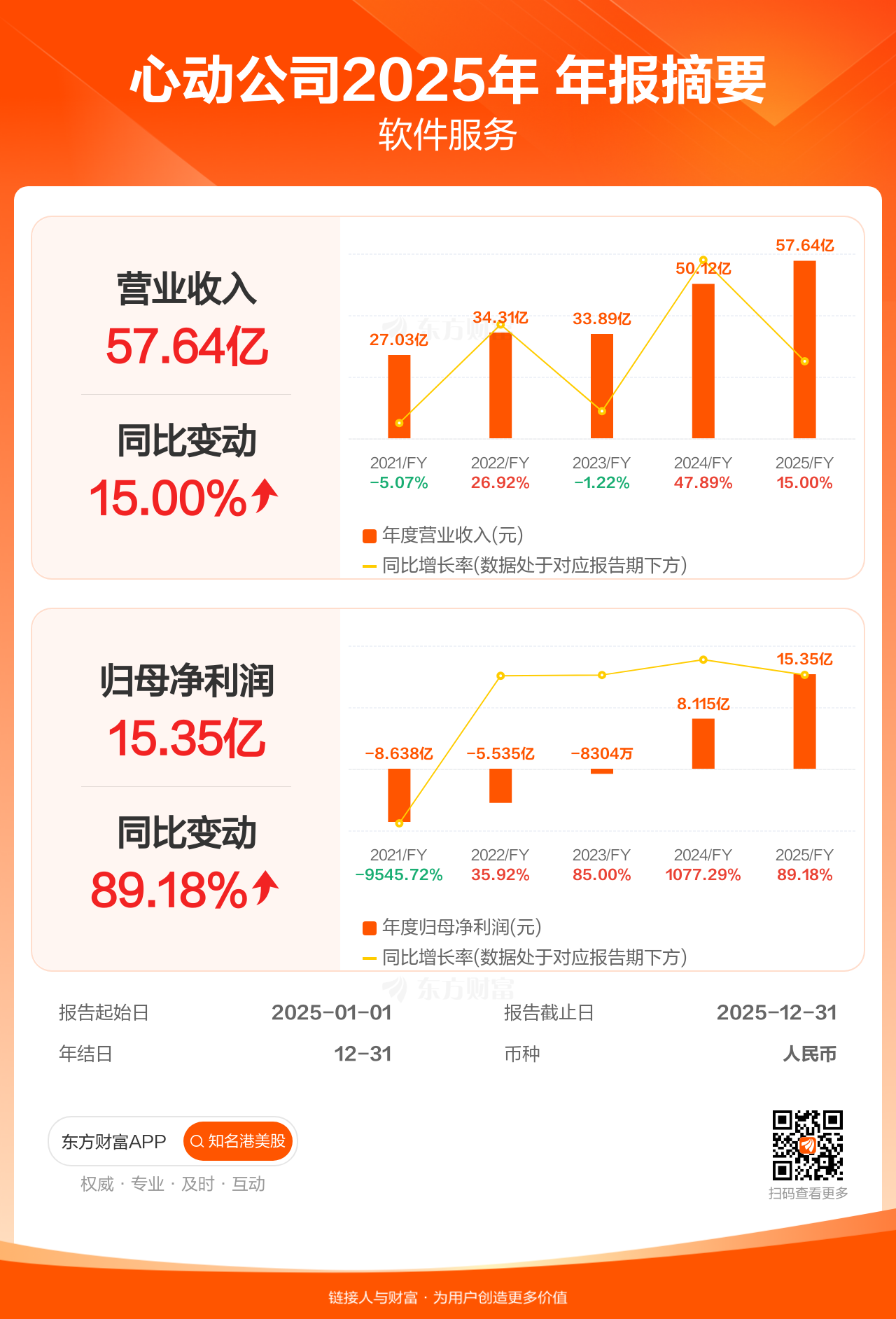 心动公司3月27日发布年报业绩,截至2025年12月31日的12个月内,该公司营业收入57.64亿人民币,同比增长15.00%;公司权益持有人应占溢利(归母净利润)15.35亿人民币,同比增长89.18%,低于机构一致预测的20.13亿人民币。