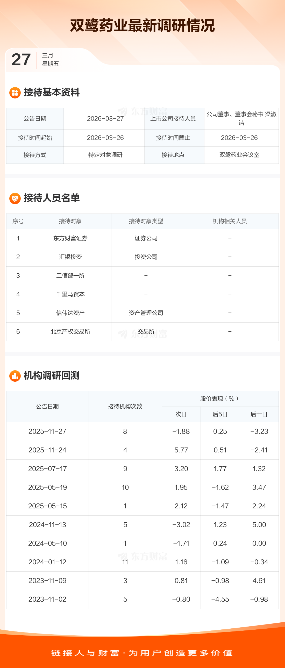 双鹭药业3月27日公告称,3月26日接待东方财富证券等6家机构调研。接待人员包括公司董事、董事会秘书 梁淑洁。