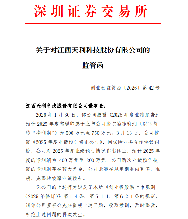 监管函显示,2026年1月30日,天利科技披露《2025年度业绩预告》,预计2025年度实现归属于上市公司股东的净利润为500万元至750万元;3月13日,公司披露《2025年度业绩预告修正公告》,因保险业务合作协议纠纷,对2025年度业绩预告情况作出修正,预计2025年度的净利润为-400万元至-200万元。公司两次业绩预告披露的净利润存在较大差异,未能在规定期限内真实、准确、完整地披露业绩预告。