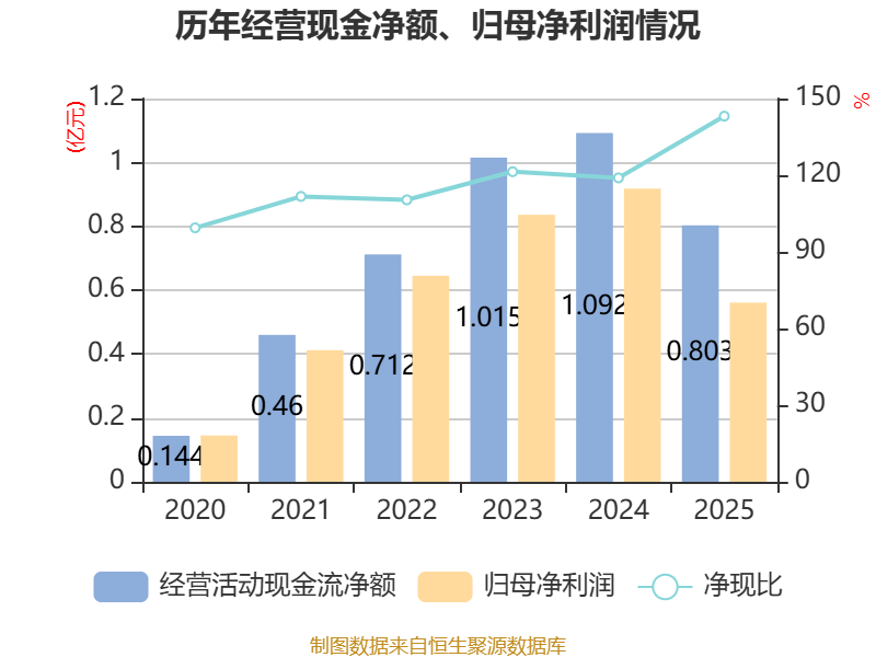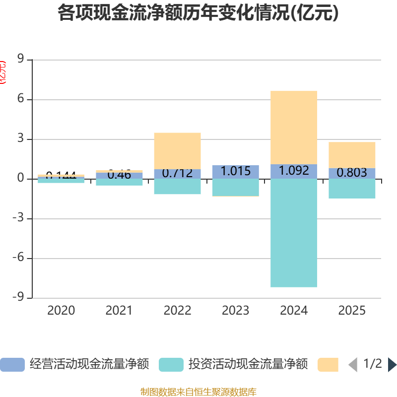 截至2025年,公司经营活动现金流净额为8027.02万元,同比下降26.52%;筹资活动现金流净额1.96亿元,同比减少3.58亿元;投资活动现金流净额-1.5亿元,上年同期为-8.2亿元。