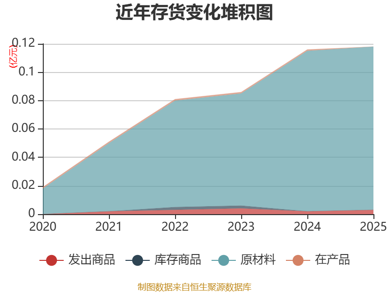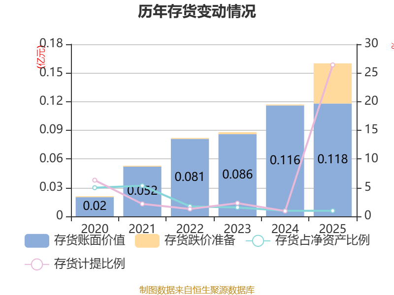 从存货变动来看,截至2025年末,公司存货账面价值为1177.06万元,占净资产的0.97%,较上年末增加21.2万元。其中,存货跌价准备为422.19万元,计提比例为26.4%。