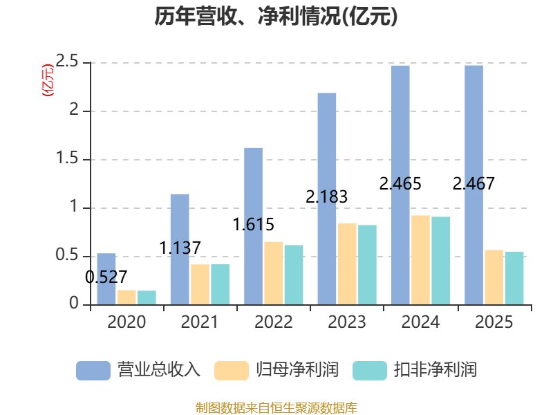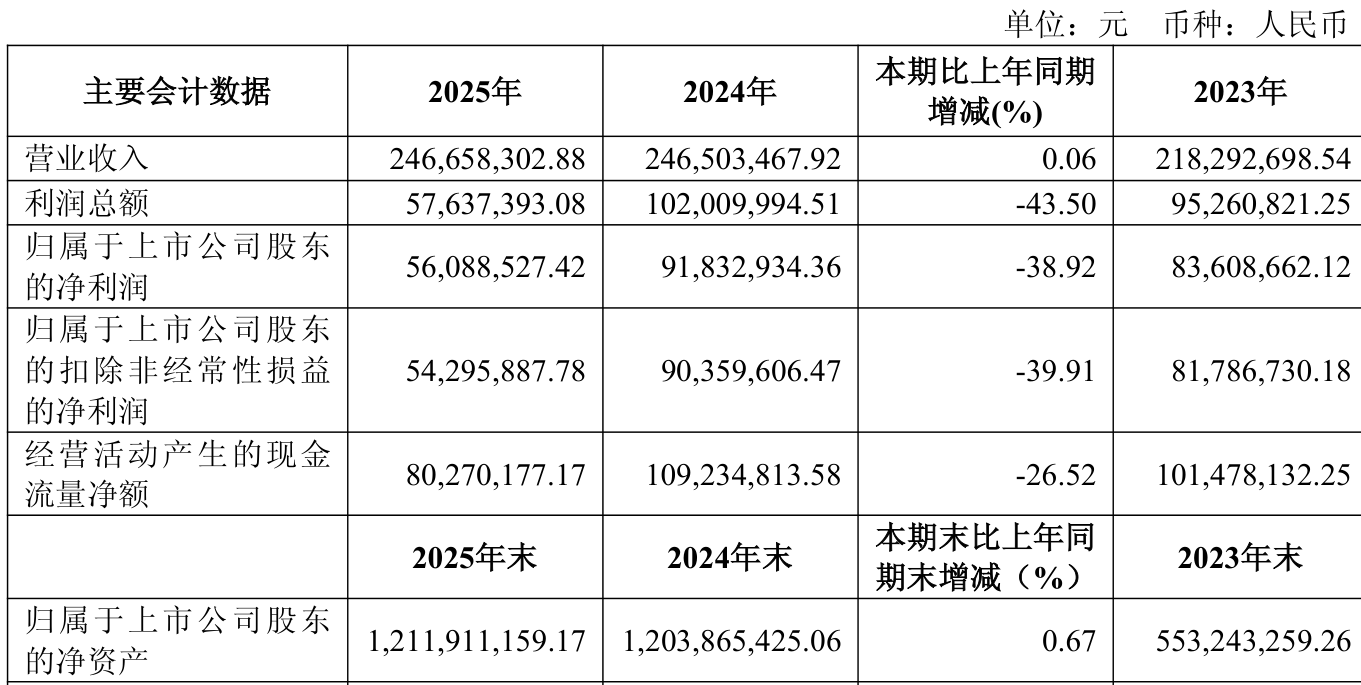 中证智能财讯龙图光罩(688721)3月27日披露2025年年度报告。2025年,公司实现营业总收入2.47亿元,同比增长0.06%;归母净利润5608.85万元,同比下降38.92%;扣非净利润5429.59万元,同比下降39.91%;经营活动产生的现金流量净额为8027.02万元,同比下降26.52%;报告期内,龙图光罩基本每股收益为0.42元,加权平均净资产收益率为4.66%。