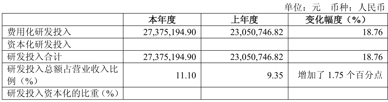 2025年全年,公司研发投入金额为2737.52万元,同比增长18.76%;研发投入占营业收入比例为11.1%,相比上年同期上升1.75个百分点。