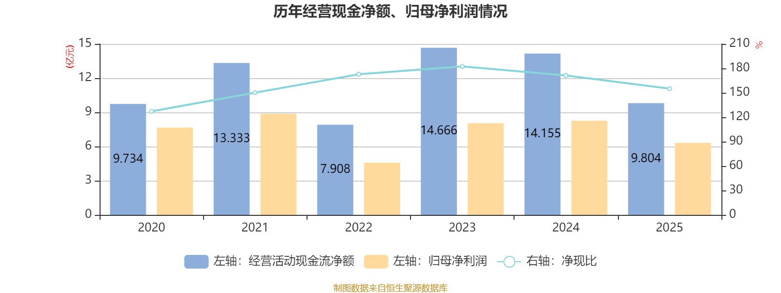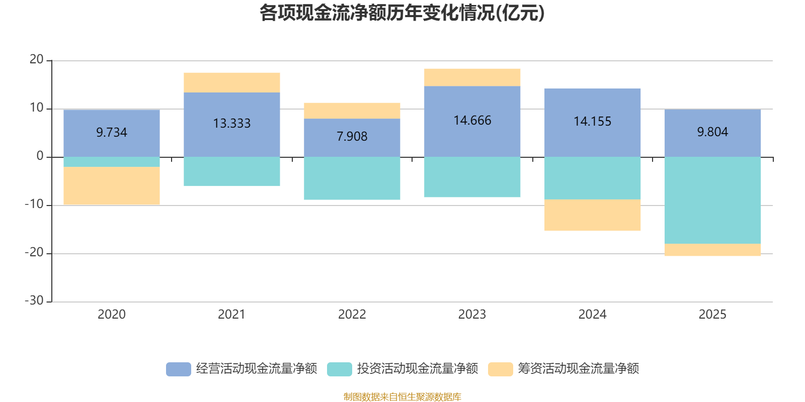 2025年,公司经营活动现金流净额为9.8亿元,同比下降30.74%;筹资活动现金流净额-2.53亿元,同比增加3.95亿元;投资活动现金流净额-18.03亿元,上年同期为-8.85亿元。