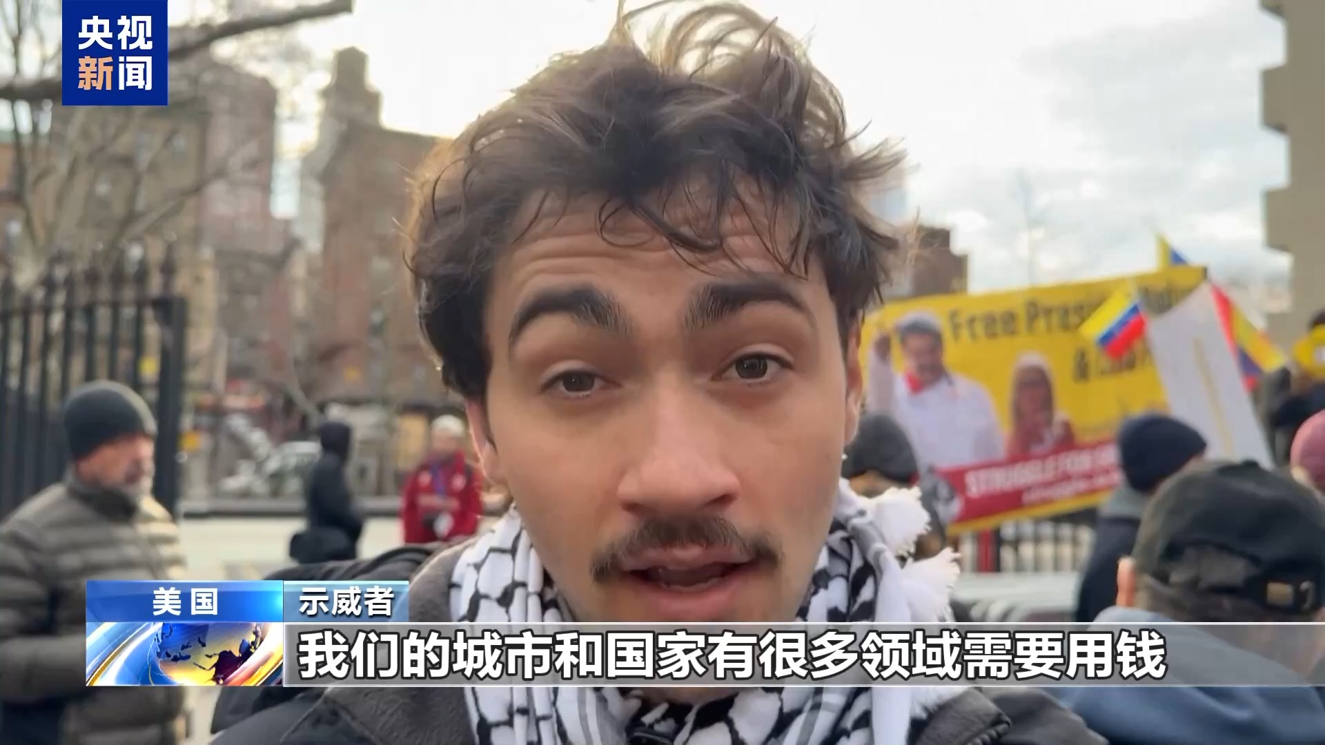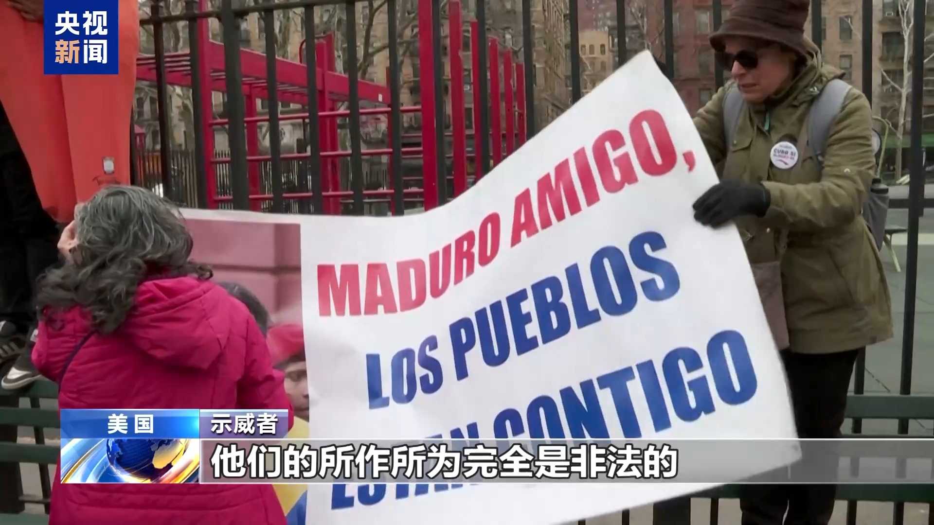 示威者:我今天来到这里,要求释放马杜罗总统和他的夫人并让他们返回自己的国家。马杜罗是委内瑞拉民选领导人,美国无权干涉委内瑞拉的内政,也无权侵犯委内瑞拉的主权。