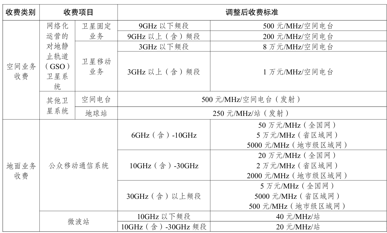 4. 对于手机直连卫星等空间地面一体化设计的通信系统,空间部分频率占用费收费标准参照同频段卫星移动业务收费标准;