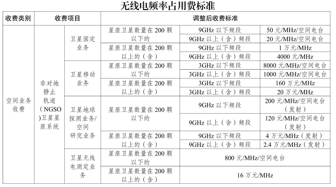 注:1.NGSO卫星星座系统用于馈线链路、卫星测控、卫星间业务等的频率,其空间电台按照发射带宽收取频率占用费,收费标准参照同频段卫星固定业务收费标准;