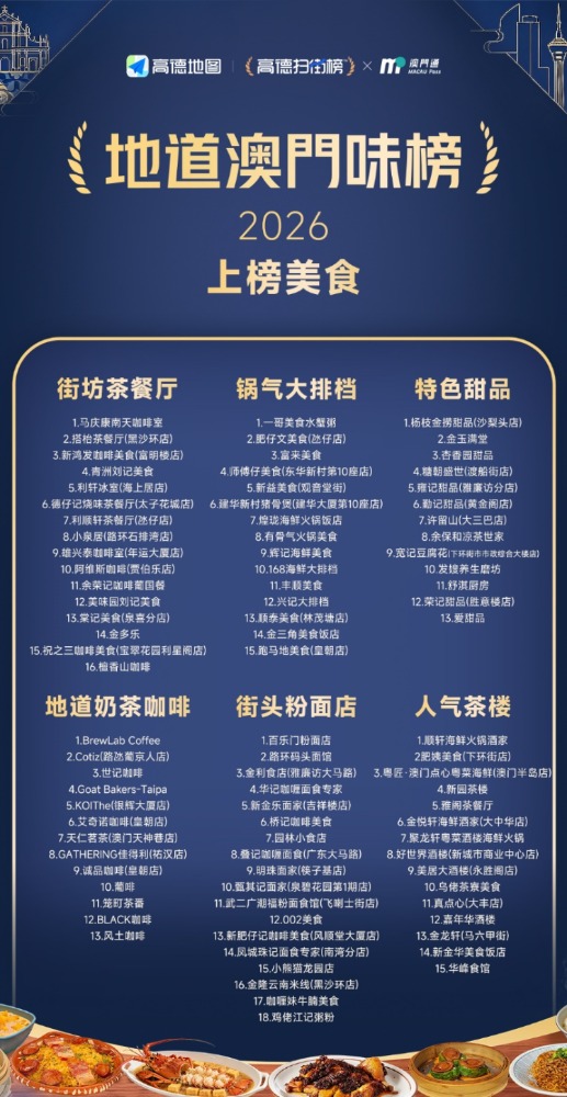 3月27日,在澳门特别行政区政府旅游局官方支持下,高德扫街榜“地道澳门味”榜单在澳门正式发布。榜单采用“用脚投票”的上榜机制,为赴澳游客提供一份真实可信的寻味指南。