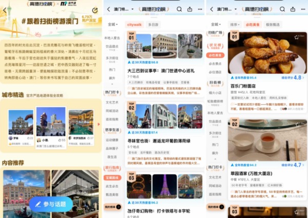 即日起,游客只需打开高德地图APP搜索“跟着扫街榜游澳门”,即可获取这份由澳门特别行政区政府旅游局官方支持发布的旅行指南,开启地道的澳门寻味之旅。