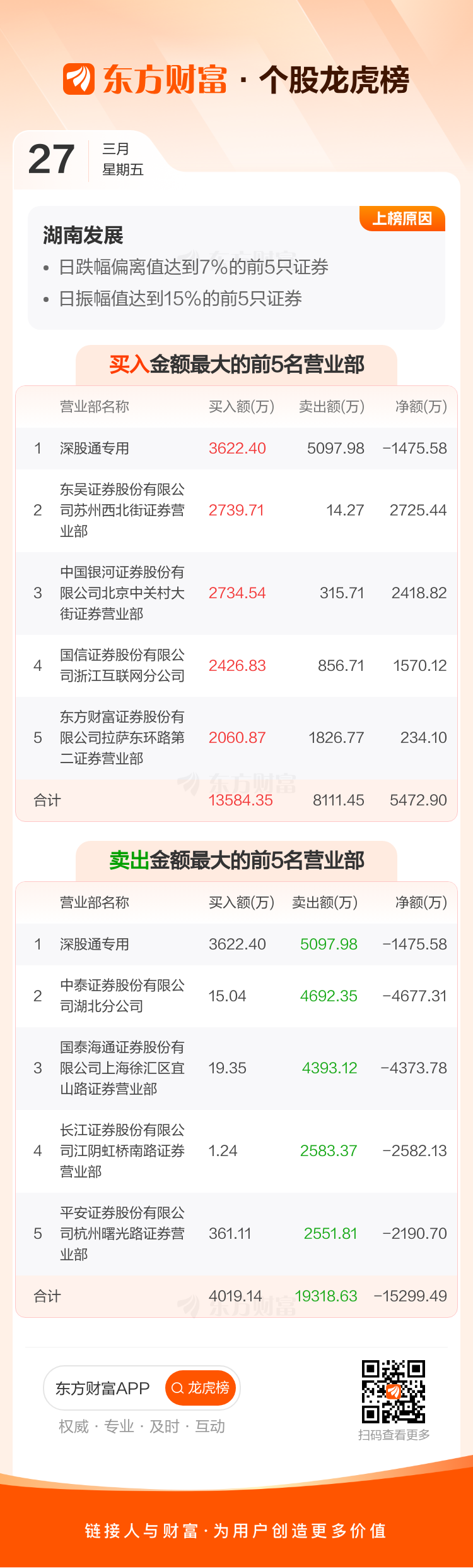 交易所2026年3月27日公布的交易公开信息显示,湖南发展因成为日振幅值达到15%的前5只证券、日跌幅偏离值达到7%的前5只证券上榜。湖南发展当日收报16.96元,涨跌幅-7.22%,偏离值17.13%,换手率26.15%,成交额21.80亿。