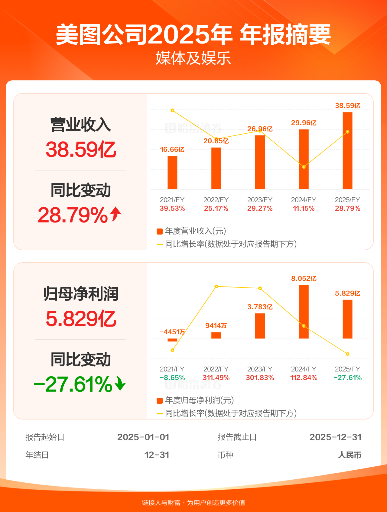 美图公司3月27日发布年报业绩,截至2025年12月31日的12个月内,该公司营业收入38.59亿人民币,同比增长28.79%;公司权益持有人应占溢利(归母净利润)5.83亿人民币,同比减少27.61%,低于机构一致预测的11.91亿人民币。