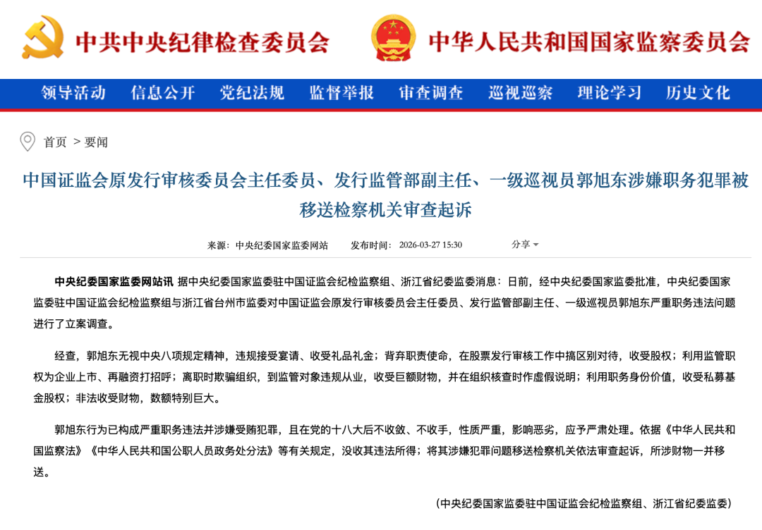 中央纪委国家监委网站3月27日通报,据中央纪委国家监委驻中国证监会纪检监察组、浙江省纪委监委消息:日前,经中央纪委国家监委批准,中央纪委国家监委驻中国证监会纪检监察组与浙江省台州市监委对中国证监会原发行审核委员会主任委员、发行监管部副主任、一级巡视员郭旭东严重职务违法问题进行了立案调查。