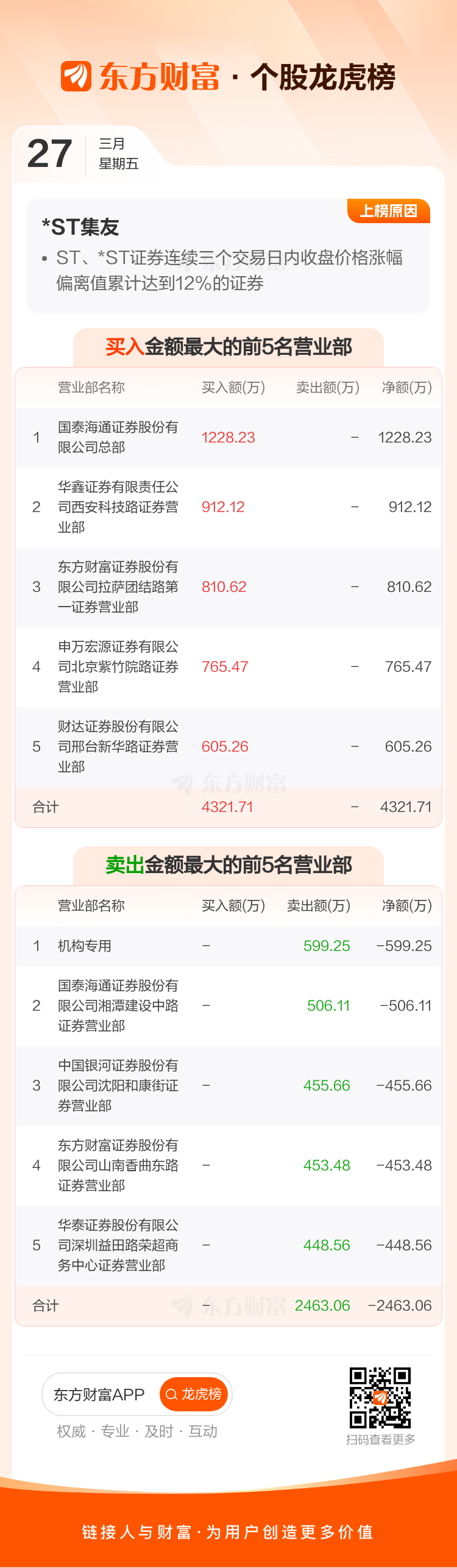 交易所2026年3月27日公布的交易公开信息显示,*ST集友因成为ST、*ST证券连续三个交易日内收盘价格涨幅偏离值累计达到12%的证券上榜。*ST集友当日收报9.36元,涨跌幅5.05%,换手率1.51%,成交额7331.41万。异常期间3月25日至3月27日,期间涨幅15.70%,累计偏离值14.86%,区间成交额2.83亿。