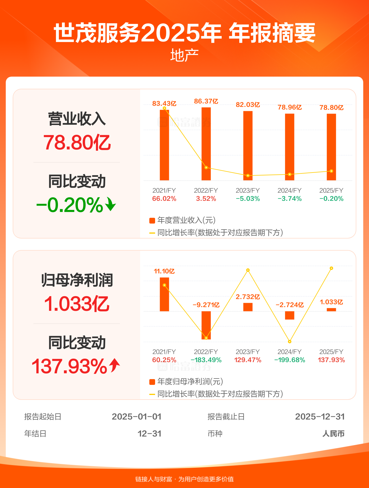 世茂服务3月27日发布年报业绩,截至2025年12月31日的12个月内,该公司营业收入78.80亿人民币,同比减少0.20%;公司权益持有人应占溢利(归母净利润)1.03亿人民币,同比增长137.93%,低于机构一致预测的2.40亿人民币。