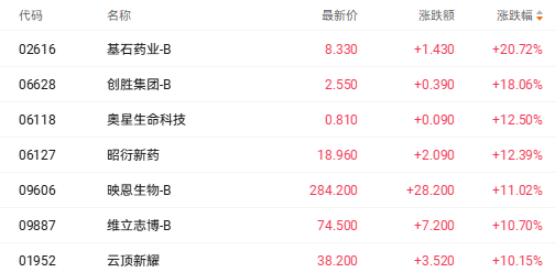 截至收盘,基石药业-B(02616.HK)涨20.72%、创胜集团-B(06628.HK)涨18.06%、昭衍新药(06127.HK)涨12.39%。