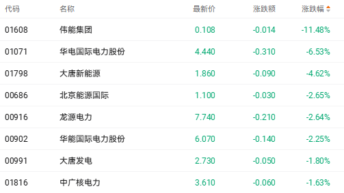 截至收盘,华能国际电力股份(00902.HK)跌6.53%、大唐新能源(01798.HK)跌4.62%、大唐发电(00991.HK)跌1.80%。