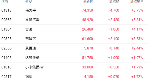 截至收盘,毛戈平(01318.HK)涨6.75%、古茗(01364.HK)涨4.17%、布鲁可(00325.HK)涨3.53%。