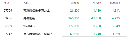 截至收盘,南方两倍做多海力士(07709.HK)跌4.31%、兆易创新(03986.HK)跌2.92%、澜起科技(06809.HK)跌2.04%。