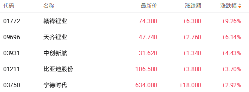 截至收盘,赣锋锂业(01772.HK)涨9.26%、天齐锂业(09696.HK)涨6.13%、中创新航(03931.HK)涨4.43%。