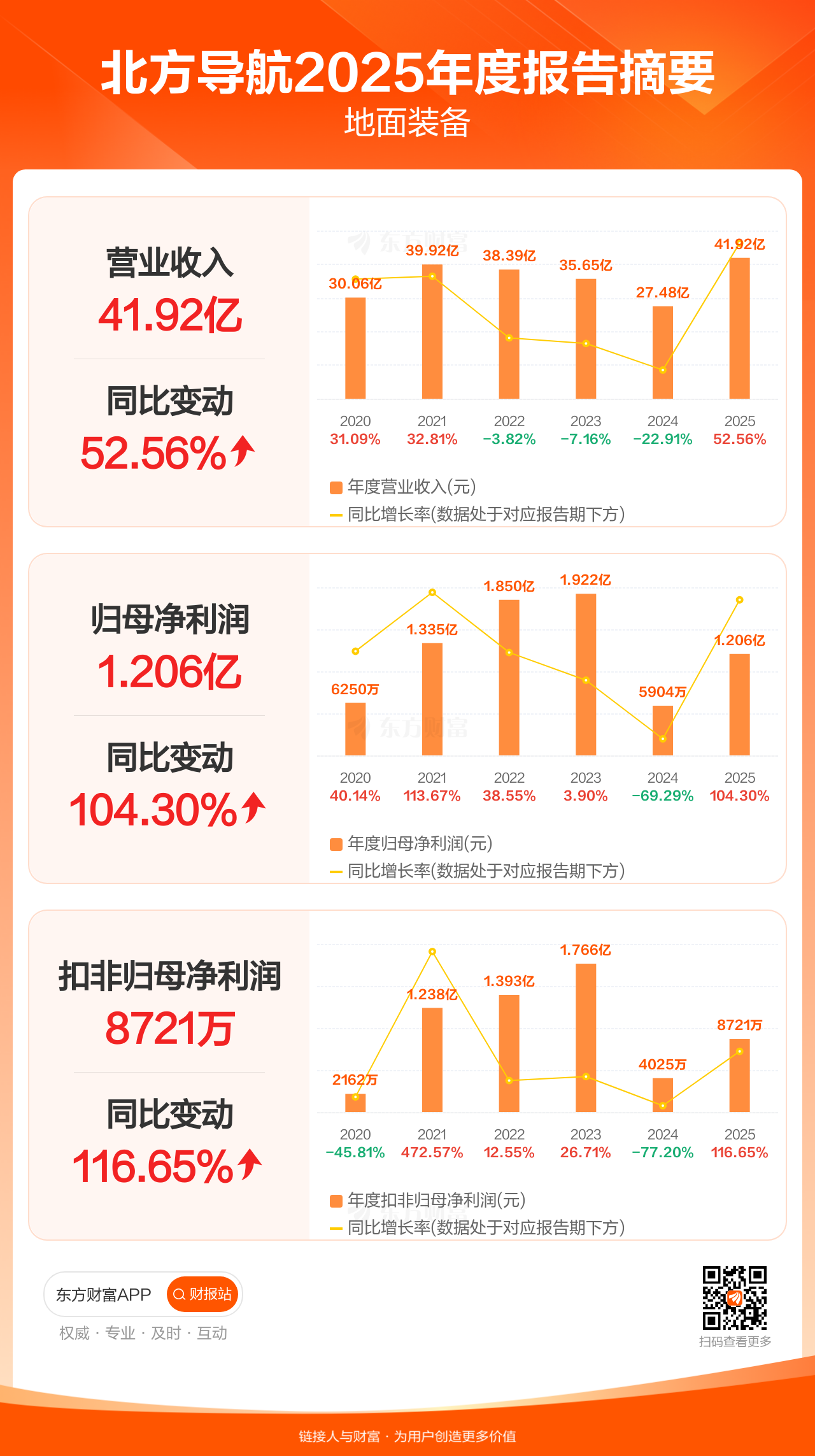 北方导航3月28日发布2025年年报显示,公司全年实现营业收入41.92亿元,同比增长52.56%;归母净利润1.21亿元,同比增长104.30%;扣非归母净利润8720.82万元,同比增长116.65%。