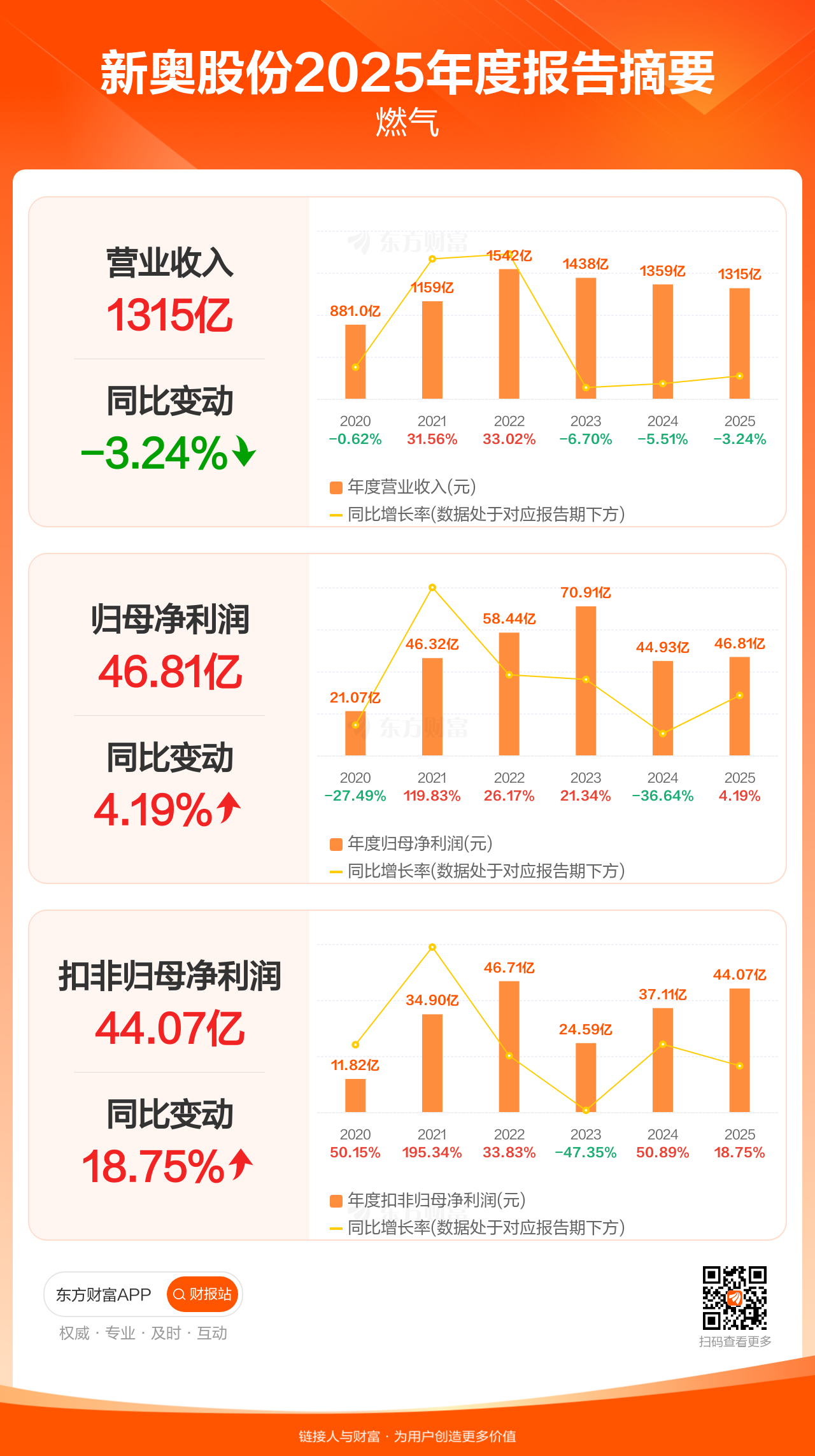新奥股份3月28日发布2025年年报显示,公司全年实现营业收入1315.07亿元,同比下滑3.24%;归母净利润46.81亿元,同比增长4.19%;扣非归母净利润44.07亿元,同比增长18.75%。