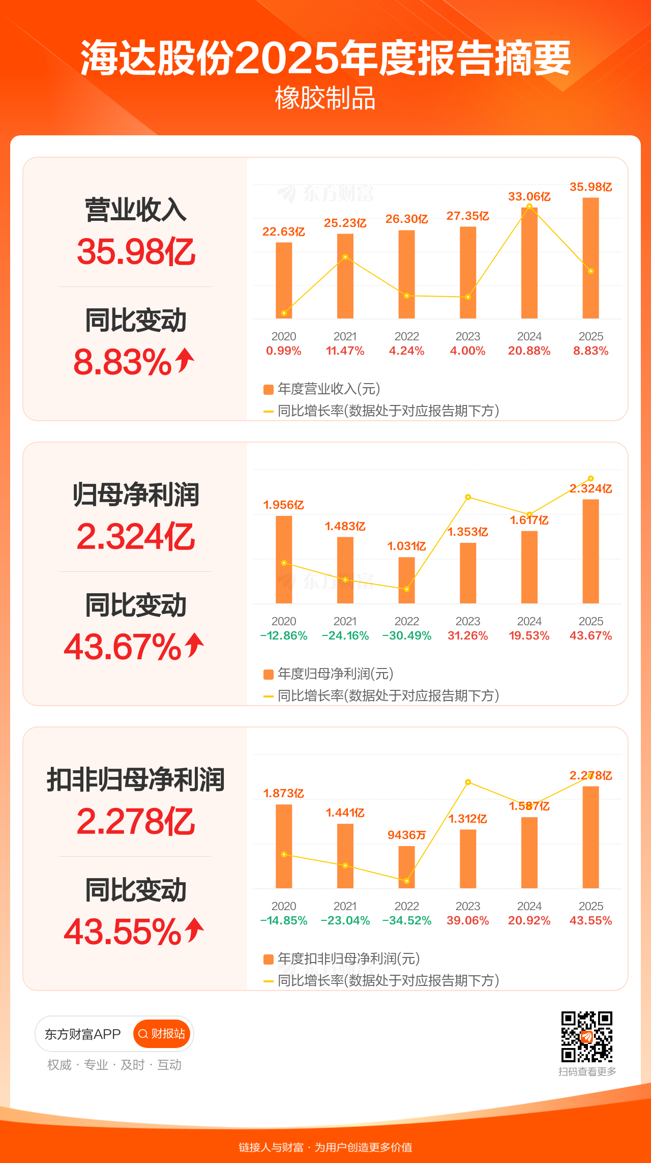 海达股份3月28日发布2025年年报显示,公司全年实现营业收入35.98亿元,同比增长8.83%;归母净利润2.32亿元,同比增长43.67%;扣非归母净利润2.28亿元,同比增长43.55%。每股EPS0.39元,低于机构一致预测的0.48元。