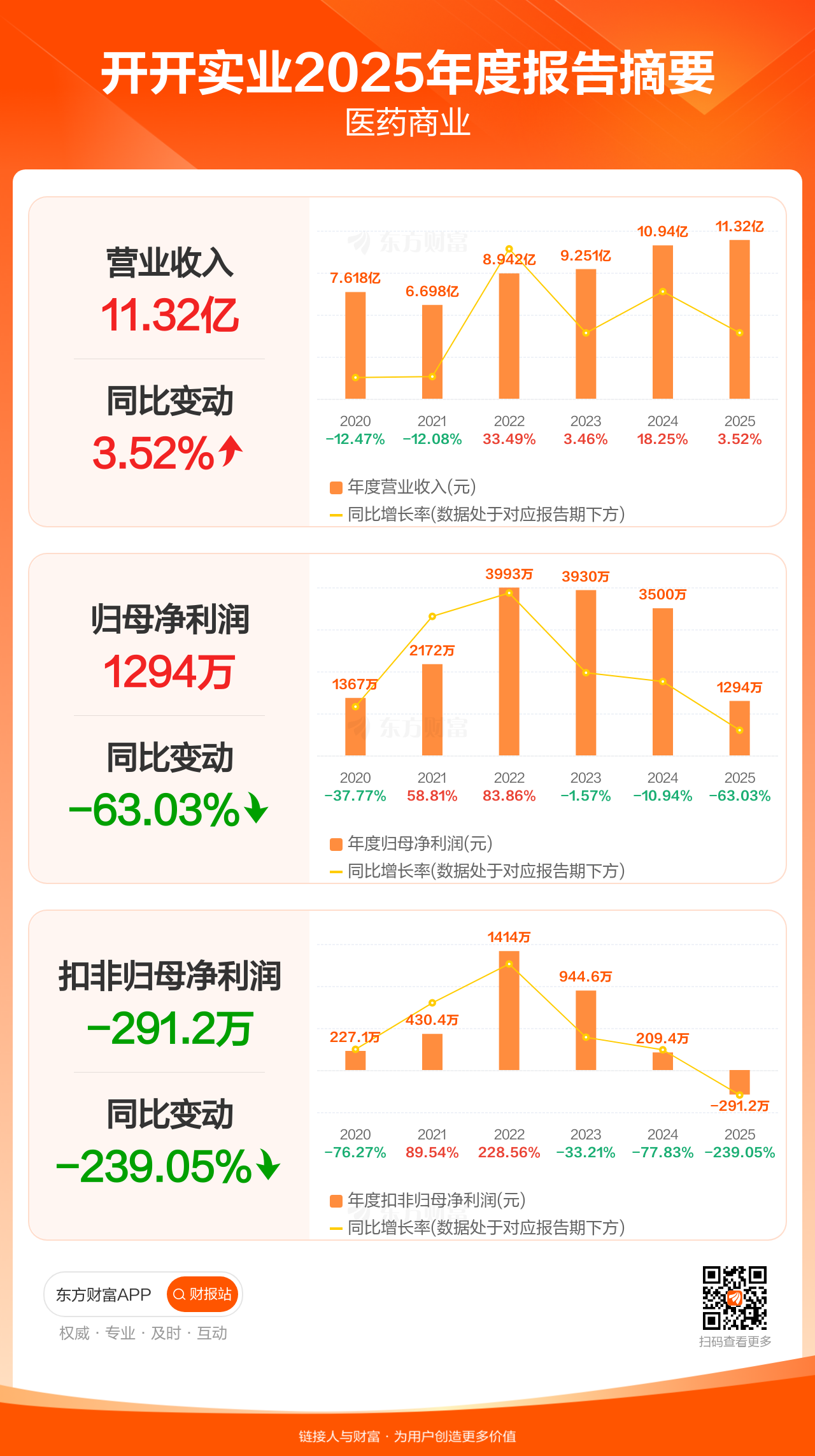 开开实业3月28日发布2025年年报显示,公司全年实现营业收入11.32亿元,同比增长3.52%;归母净利润1293.75万元,同比下滑63.03%;扣非归母净利润-291.20万元。