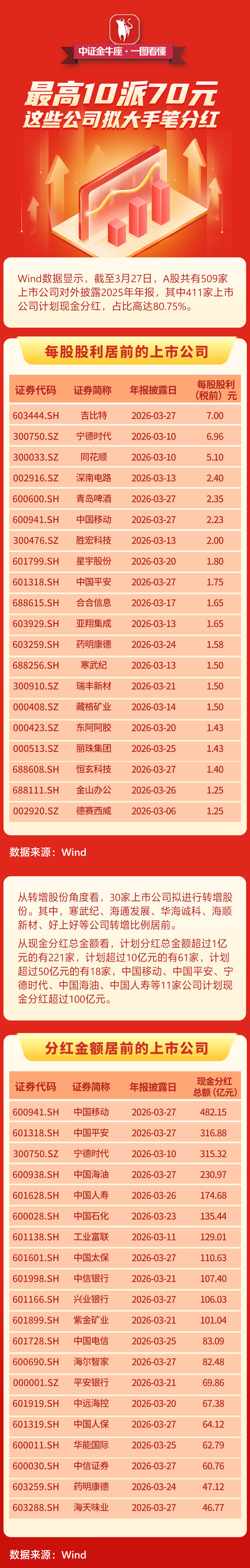 【一图看懂】最高10派70元,这些公司拟大手笔分红