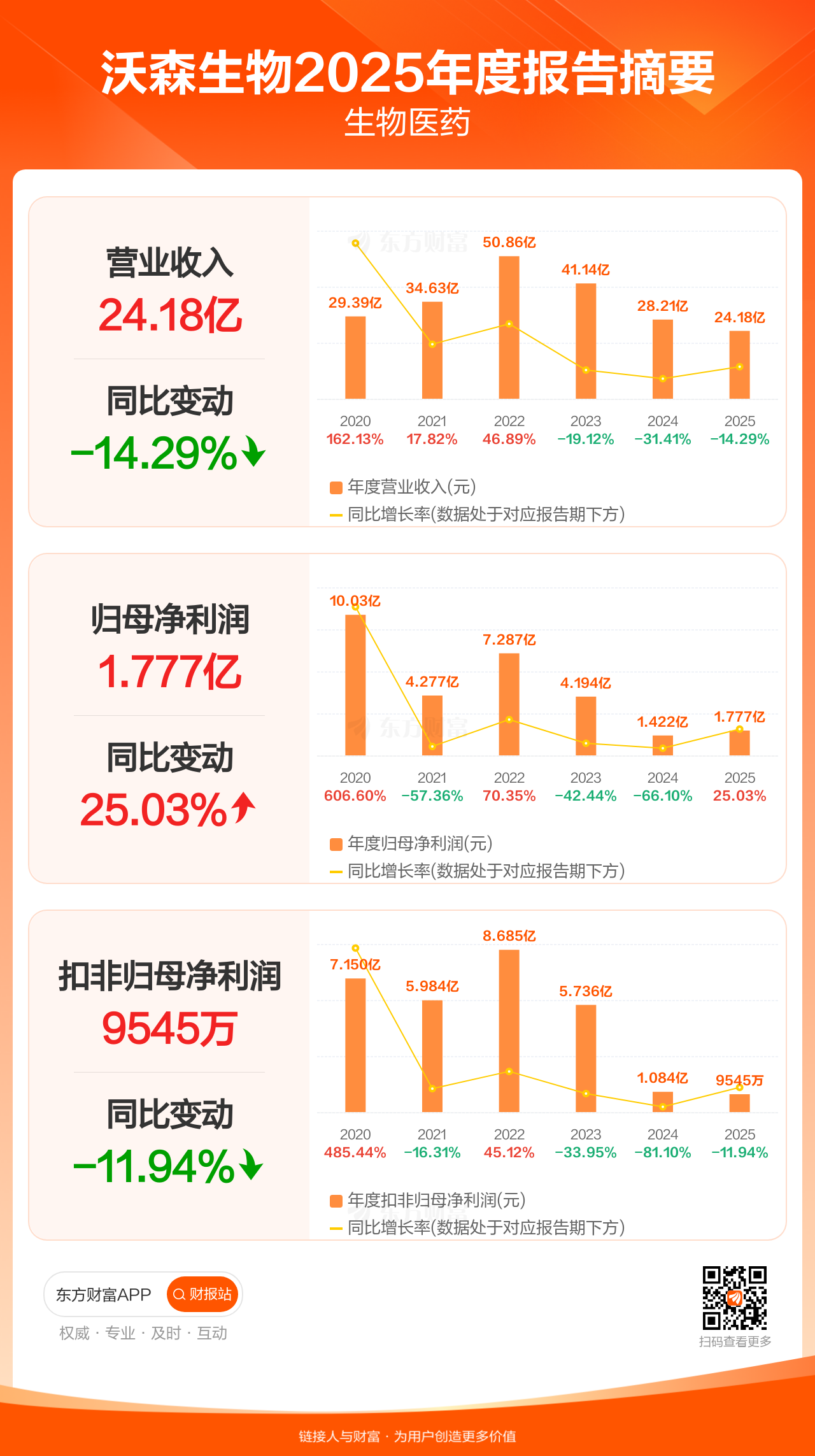 沃森生物3月28日发布2025年年报显示,公司全年实现营业收入24.18亿元,同比下滑14.29%;归母净利润1.78亿元,同比增长25.03%;扣非归母净利润9545.09万元,同比下滑11.94%。