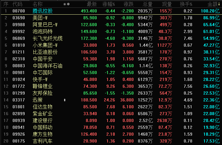 港股成交额前二十