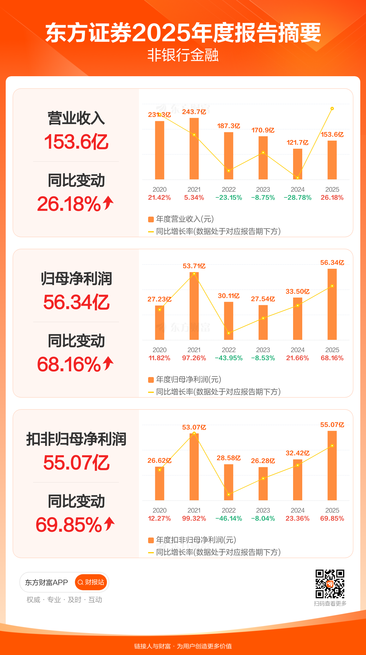 东方证券3月28日发布2025年年报显示,公司全年实现营业收入153.58亿元,同比增长26.18%;归母净利润56.34亿元,同比增长68.16%;扣非归母净利润55.07亿元,同比增长69.85%。