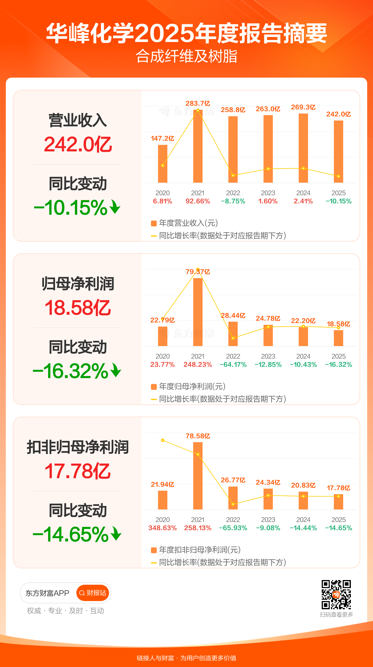 华峰化学3月28日发布2025年年报显示,公司全年实现营业收入241.98亿元,同比下滑10.15%;归母净利润18.58亿元,同比下滑16.32%;扣非归母净利润17.78亿元,同比下滑14.65%。