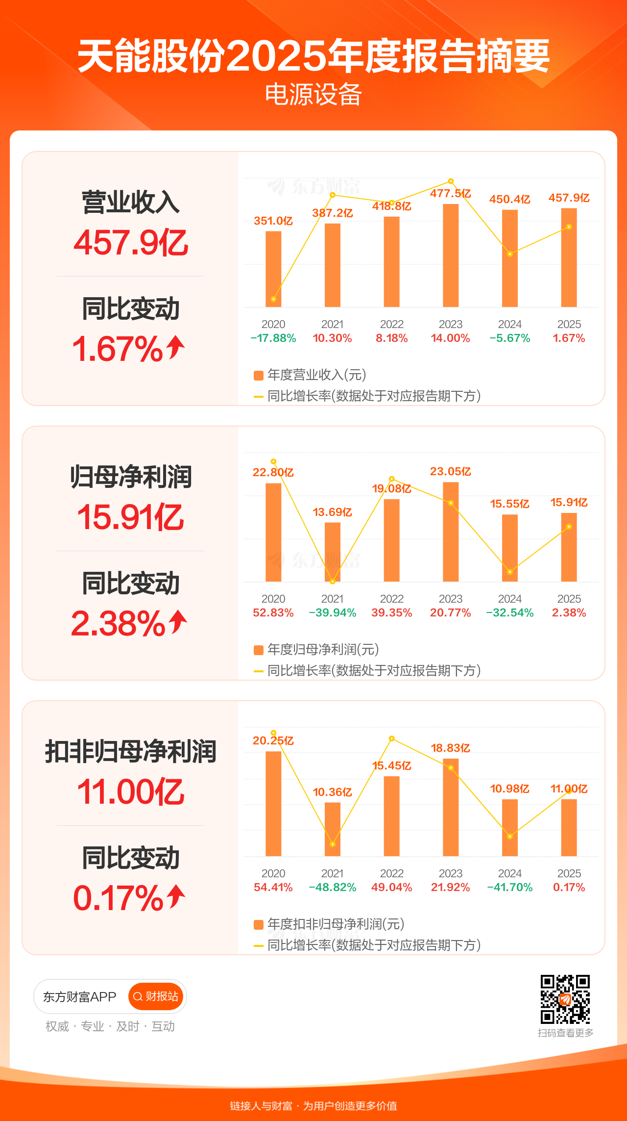 天能股份3月28日发布2025年年报显示,公司全年实现营业收入457.92亿元,同比增长1.67%;归母净利润15.91亿元,同比增长2.38%;扣非归母净利润11.00亿元,同比增长0.17%。每股EPS1.64元,低于机构一致预测的2.57元。
