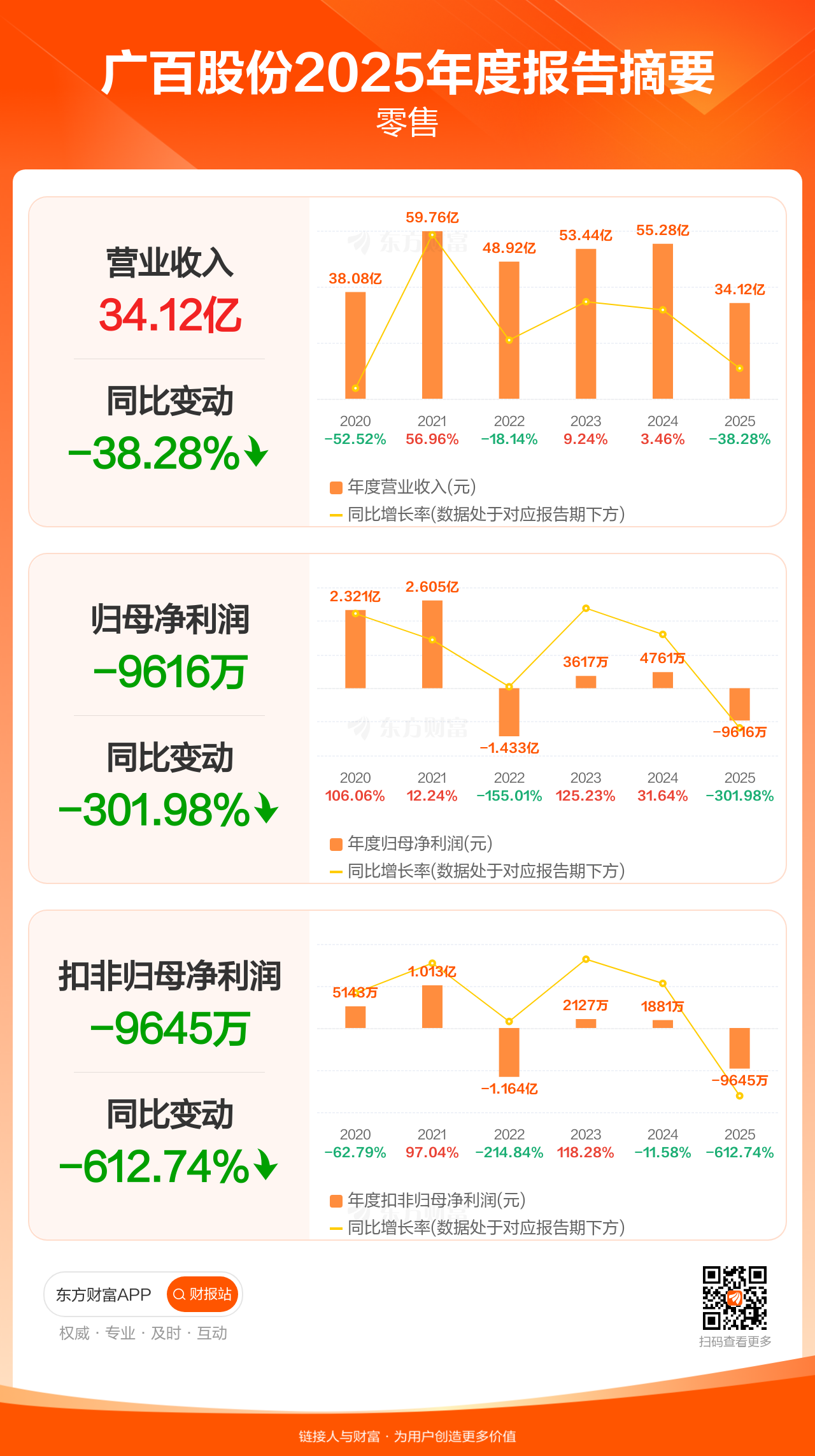 广百股份3月28日发布2025年年报显示,公司全年实现营业收入34.12亿元,同比下滑38.28%;归母净利润-9615.66万元;扣非归母净利润-9645.36万元。