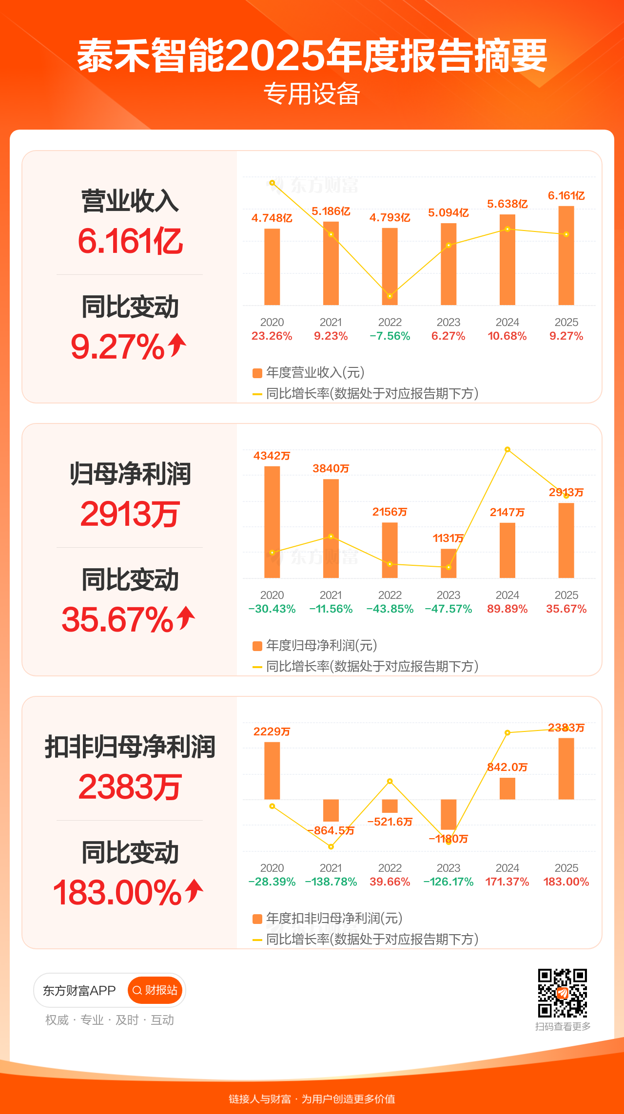 泰禾智能3月28日发布2025年年报显示,公司全年实现营业收入6.16亿元,同比增长9.27%;归母净利润2912.78万元,同比增长35.67%;扣非归母净利润2382.73万元,同比增长183.00%。