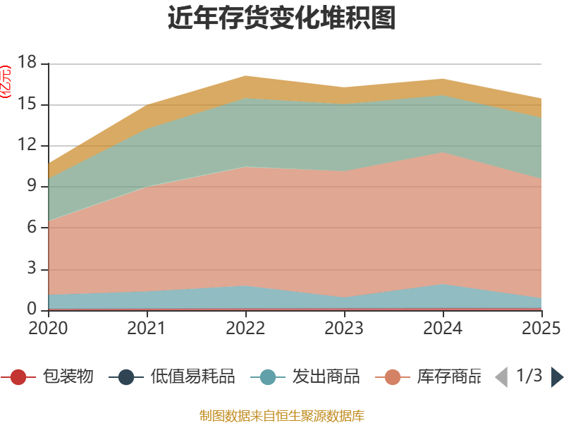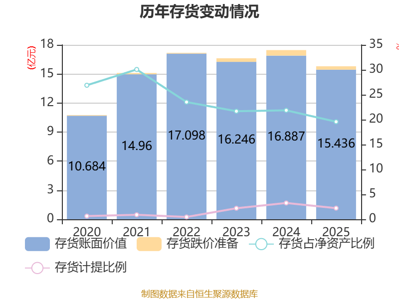 从存货变动来看,截至2025年末,公司存货账面价值为15.44亿元,占净资产的19.57%,较上年末减少1.45亿元。其中,存货跌价准备为3521.63万元,计提比例为2.23%。