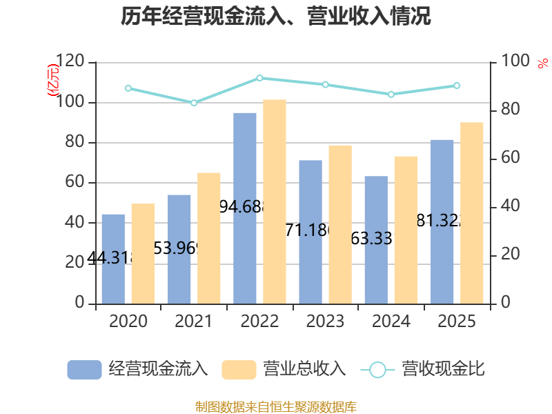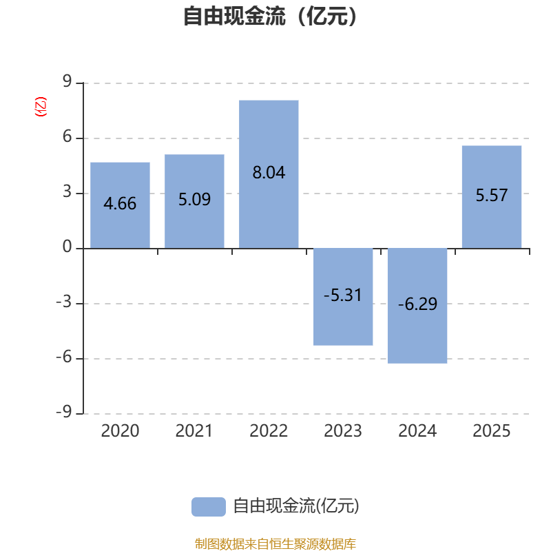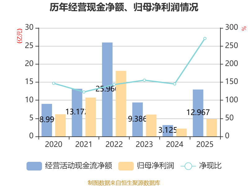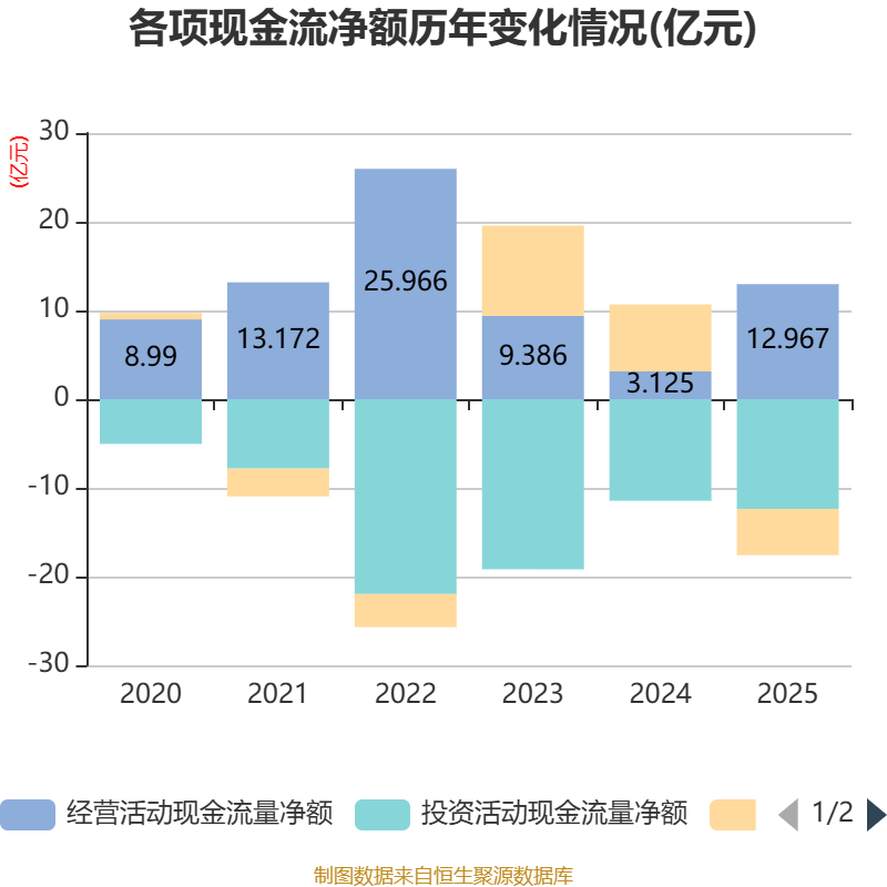 截至2025年,公司经营活动现金流净额为12.97亿元,同比增长314.93%;筹资活动现金流净额-5.2亿元,同比减少12.75亿元;投资活动现金流净额-12.38亿元,上年同期为-11.46亿元。