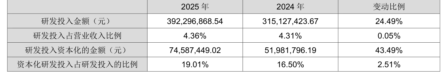 2025年全年,公司研发投入金额为3.92亿元,同比增长24.49%;研发投入占营业收入比例为4.36%,相比上年同期上升0.05个百分点。此外,公司全年研发投入资本化率为19.01%。