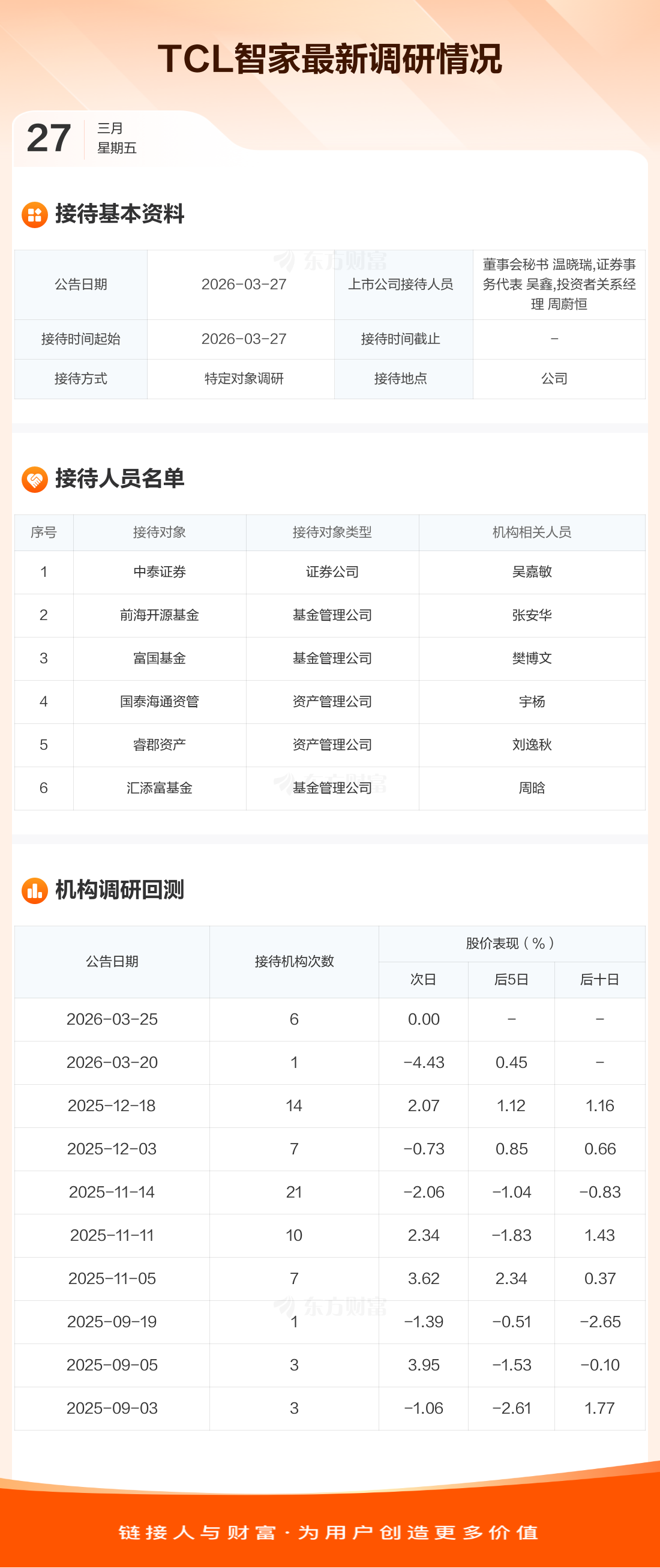 TCL智家3月27日公告称,3月27日接待中泰证券等6家机构调研。接待人员包括董事会秘书 温晓瑞,证券事务代表 吴鑫,投资者关系经理 周蔚恒。