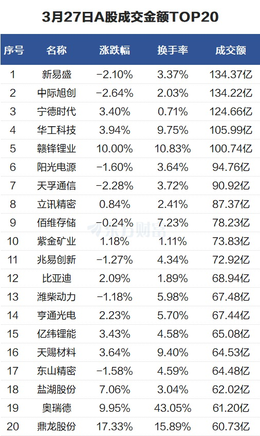 沪深两市成交额1.85万亿元,较上一交易日缩量903亿元。个股方面,新易盛当日成交134.37亿元。中际旭创当日成交134.22亿元。