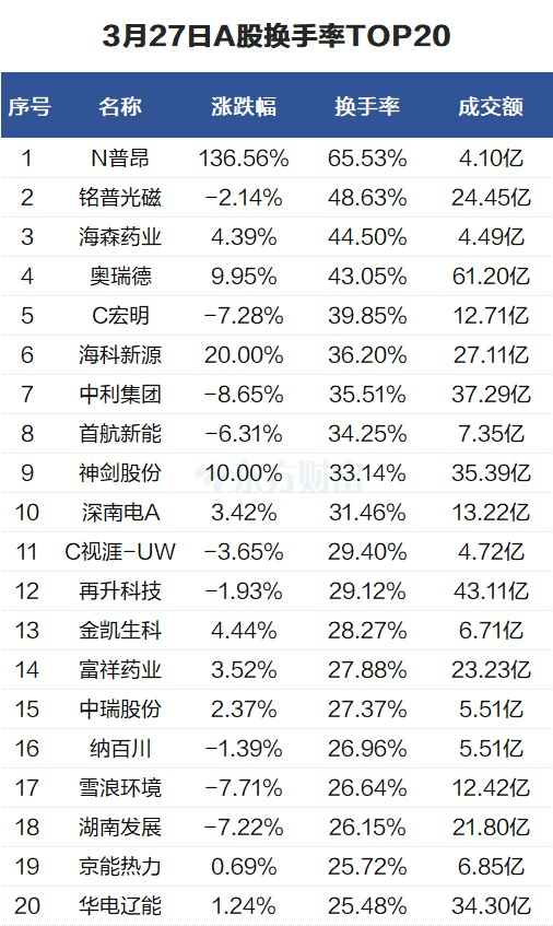当天换手率最高的个股为N普昂,全天换手率65.53%。铭普光磁紧随其后,全天换手率48.63%。