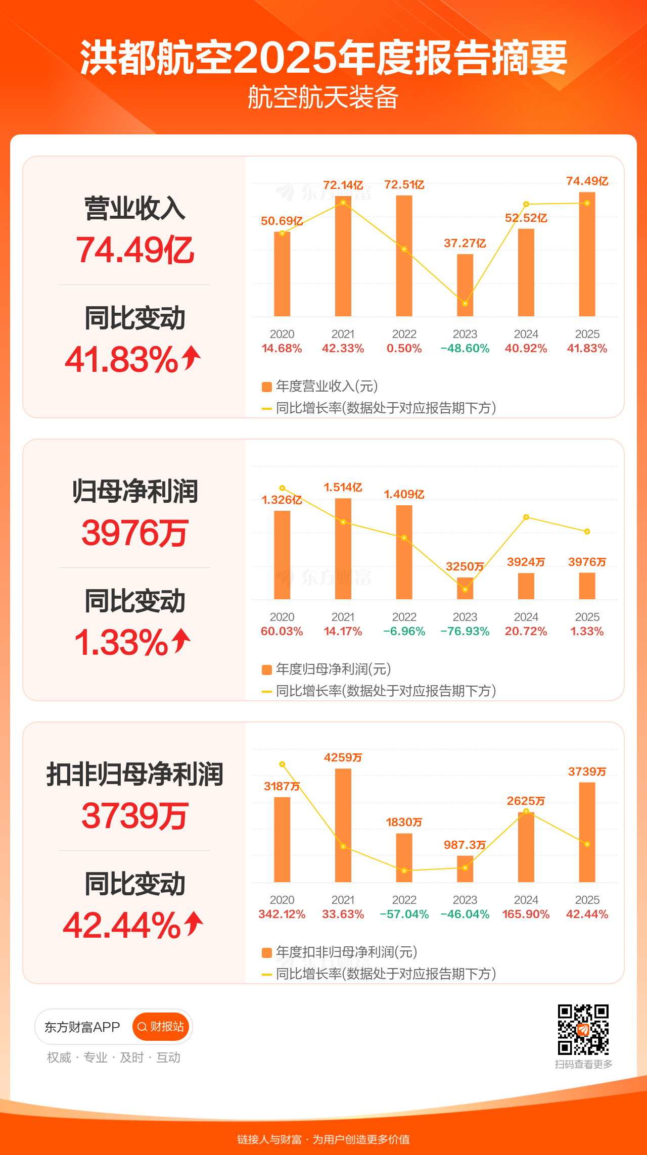 洪都航空3月28日发布2025年年报显示,公司全年实现营业收入74.49亿元,同比增长41.83%;归母净利润3975.98万元,同比增长1.33%;扣非归母净利润3739.35万元,同比增长42.44%。