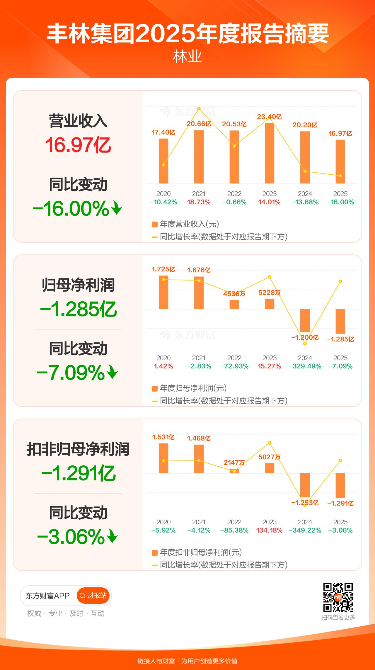丰林集团3月28日发布2025年年报显示,公司全年实现营业收入16.97亿元,同比下滑16.00%;归母净利润-1.28亿元;扣非归母净利润-1.29亿元。