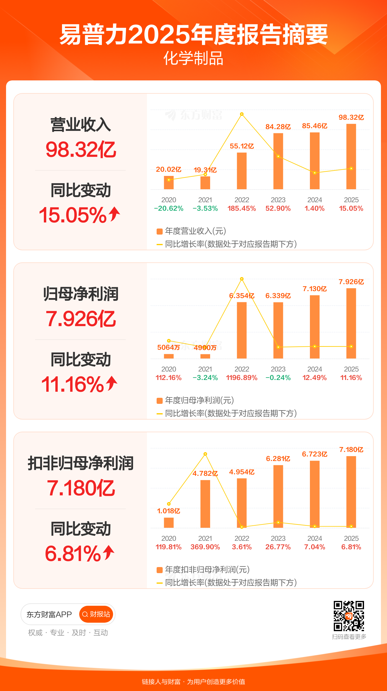 易普力3月28日发布2025年年报显示,公司全年实现营业收入98.32亿元,同比增长15.05%;归母净利润7.93亿元,同比增长11.16%;扣非归母净利润7.18亿元,同比增长6.81%。
